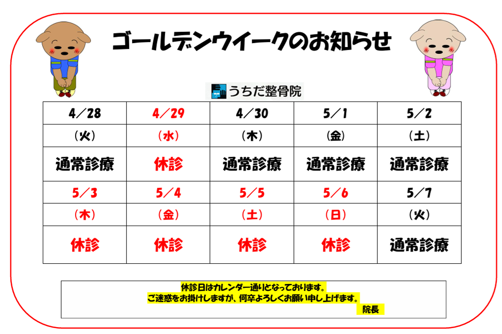 ホーム > うちだ整骨院 スタッフブログ > GWの休診日のお知らせ